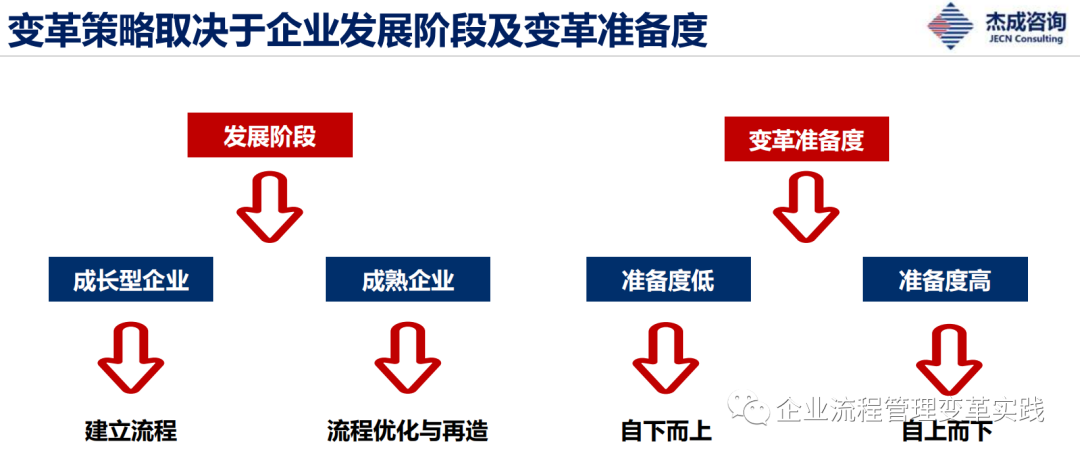 企业在差别的生长阶段,,,,以及差别的厘革准备下都会爆发差别的厘革战略。。。。以是我们要看一下,,,,盛煌娱乐企业目今处于什么生长阶段。。。。好比说成恒久的企业和成熟期的企业,,,,厘革的战略就纷歧样。。。。关于一个从创业期步入成恒久的企业,,,,首先要做治理转型。。。。从已往依赖企业家精神和小我私家英雄,,,,到培育组织的能力,,,,那么流程首先要解决从无到有的问题。。。。这个阶段,,,,要培育整个组织流程规则意识和尊重意识。。。。也许制订的流程不是最佳的,,,,但可以通过尊重以后再去一连优化。。。。可是关于上了规模的成熟期的企业,,,,最大的问题和挑战就是至公司病。。。。组织对市场需求的反应和交互的效率,,,,以及运营本钱都保存很大的问题。。。。以是这就需要通过一些流程的优化和制作来解决这些问题,,,,由于组织的流程太臃肿、并且碎片化协同断点多。。。。以是在企业差别的生长阶段,,,,有差别的厘革战略。。。。