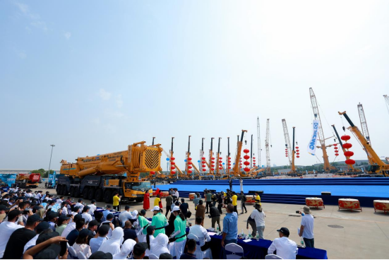 全球最大的轮式起重机制造基地内,,,,舞龙舞狮夹道相迎,,,,差别型号的“大咖”产品纷纷前来“坐镇”,,,,在蓝天白云映衬下,,,,钢铁臂膀光泽凛冽,,,,步队严阵以待,,,,以高规格的产品礼仪,,,,向全球客户致以最高尚的敬意。。。