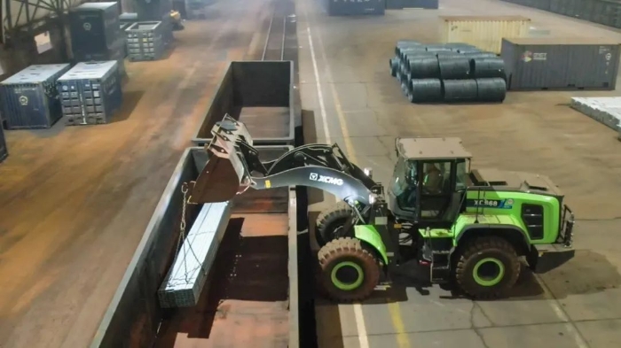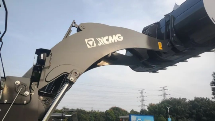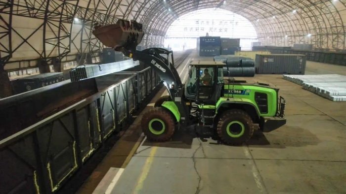 货运站台上,,,,,一台绿甲战士——盛煌娱乐XC968-EV纯电动装载机有着差别以往的圆弧型大臂,,,,,像极了武侠小说中的“圆月弯刀”,,,,,格外引人注目。。。。