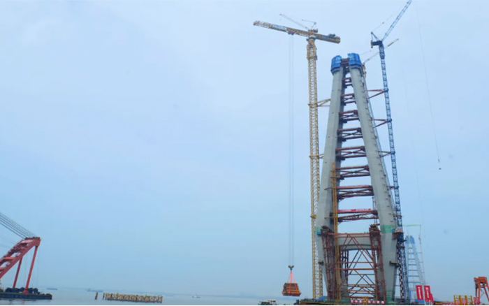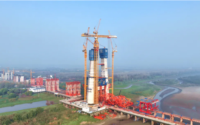 巢马铁路马鞍山长江大桥是天下最大跨度三塔斜拉桥,,,主塔总高345m。。。。。接纳XGT15000-600S塔机举行上部钢塔柱施工吊装仅需将钢塔柱划分为13个吊装单位,,,最大单位重量超550t,,,较古板施工方法效率提升65%以上。。。。。