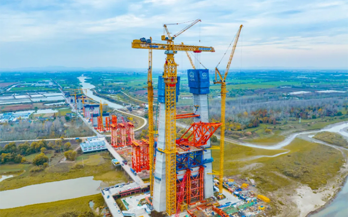 常泰长江大桥主航道桥主跨1176m,,,主塔总高352m。。。。。接纳XGT15000-600S塔机举行上部钢塔柱施工吊装仅需将钢塔柱划分为30个吊装单位,,,最大单位重量超500t,,,较古板施工方法效率提升60%以上。。。。。