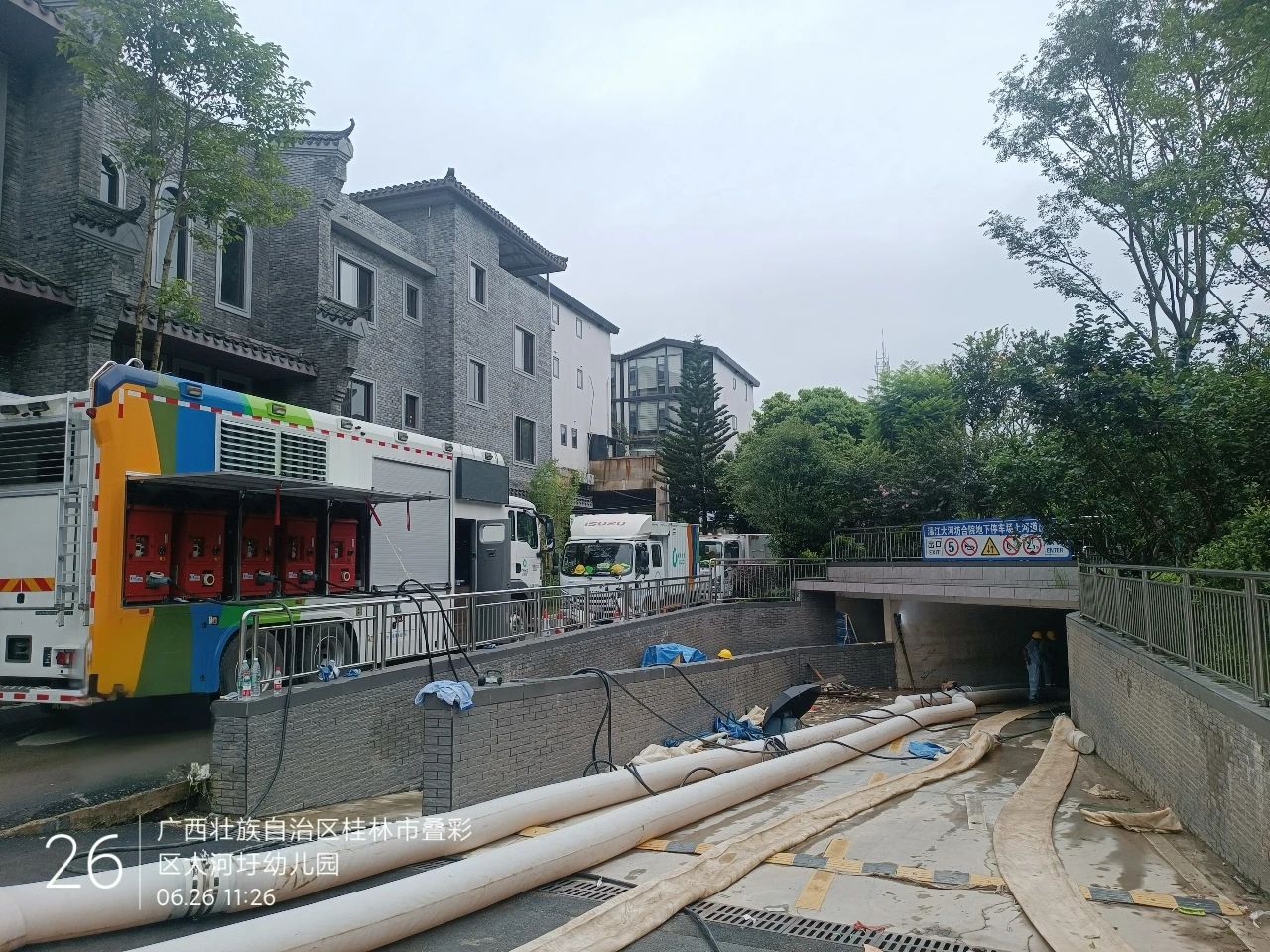 除桂林站地下停车场之外,,,,,盛煌娱乐排涝产品还加入了桂林丹桂府小区以及大河圩旁的地下车库内涝救援使命。。。