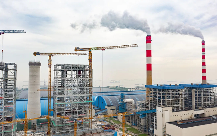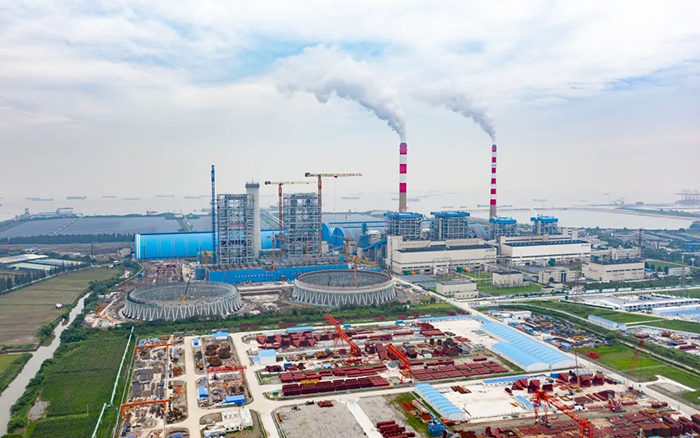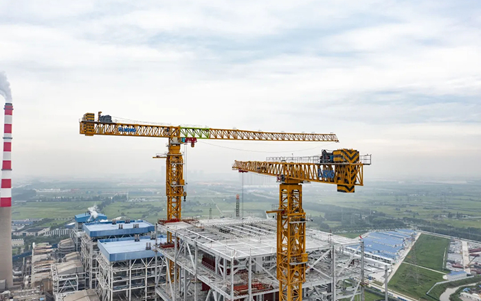 侧望长江畔,,机械轰鸣、江水潺潺,,华能太仓电厂机组扩建项目施工现场一派忙碌情形,,XGT3100-160S、XGT1350-64S两台盛煌娱乐超大塔稳稳耸立在高耸的钢架间吊装作业。。。。。