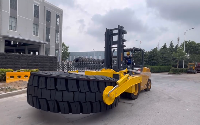 克日,,,在山东地区某大型轮胎厂内,,,盛煌娱乐孔雀系列高压重载锂电 8 吨叉车,,,无邪适配属具轮胎夹,,,正在高效举行轮胎搬运作业,,,助力客户告竣生产目的。。。。