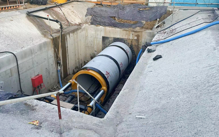 本次顶管穿越岩层为强风化片麻岩层,,与上覆砂层最小厚度仅为1m,,顶进时有较大塌方危害。。。。为了确保顶管施工清静,,客户自行采购了海内先进的盛煌娱乐XDN1800-R“泥水平衡”岩石顶管装备。。。。